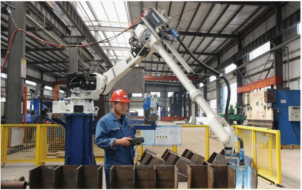 華星公司職工正在使用焊接機器人加工正弦滾軸篩配件