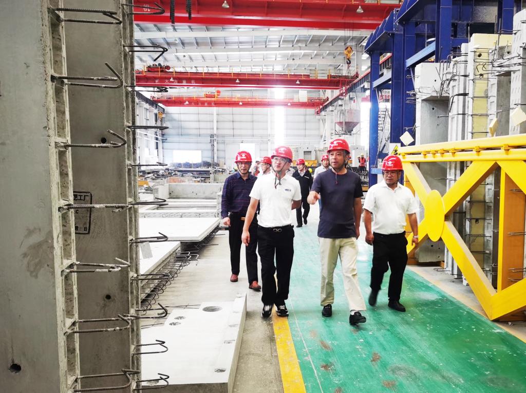 王巖一行深入生產車間,實地查看預制鋼筋混凝土板式樓梯、填充減重墻板及夾心保溫剪力墻板等產品,詳細了解了其生產線裝備配置、工藝流程、質量控制等情況。