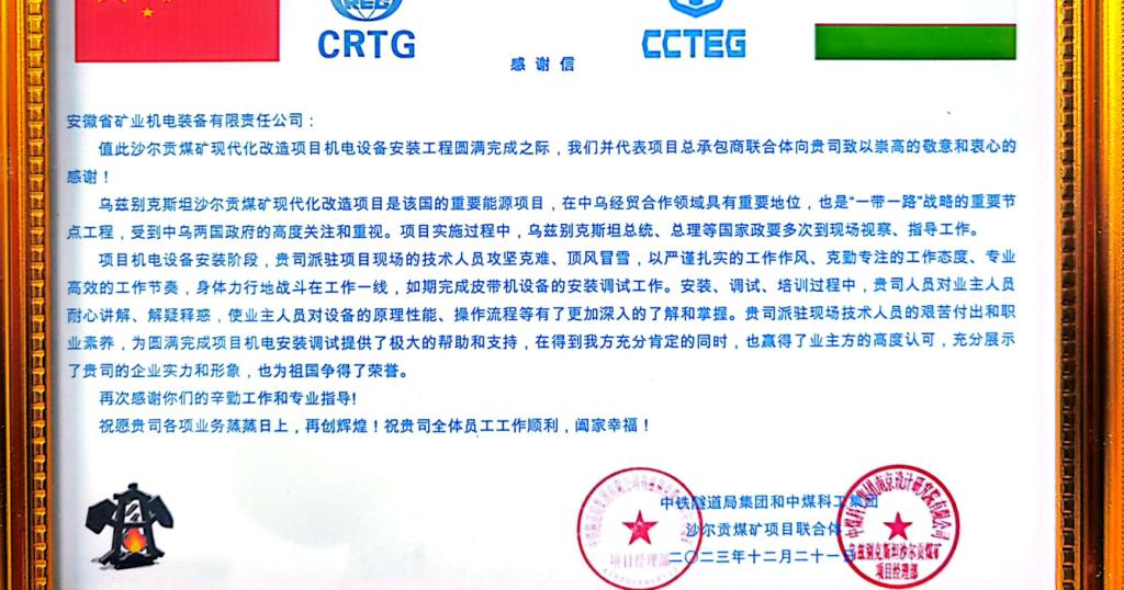 在歲末年初之際,安徽礦機工達公司收到一封中鐵隧道局集團和中煤科工集團沙爾貢煤礦項目聯合體發來的感謝信,感謝該公司不畏艱苦、攻堅克難,堅守烏茲別克斯坦沙爾貢煤礦現代化改造項目一線40余天,圓滿完成皮帶機設備安裝調試任務。
