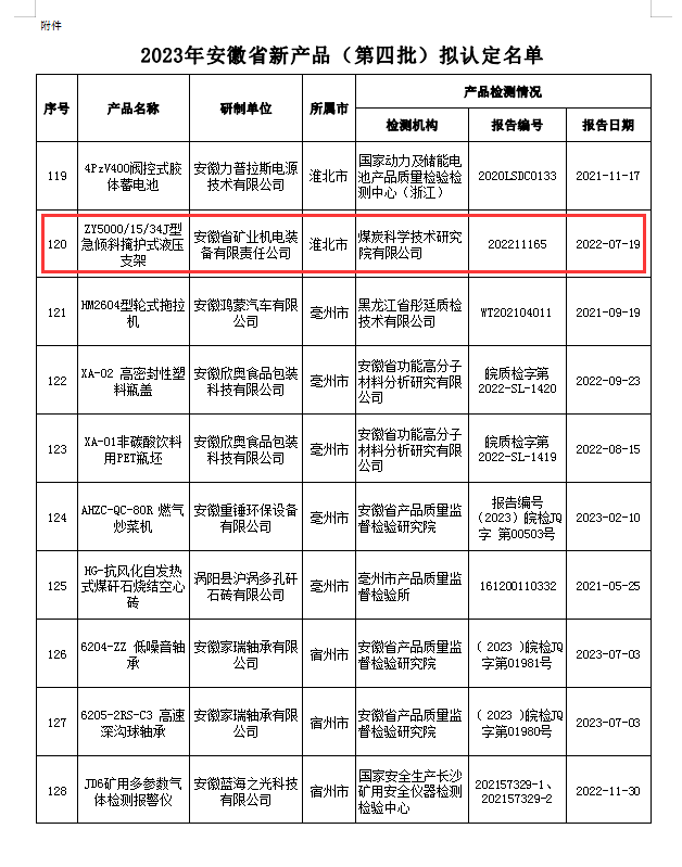 1月29日,安徽省經(jīng)濟(jì)和信息化廳下發(fā)安徽省新產(chǎn)品(2023年第四批)名單,安徽礦機(jī)產(chǎn)品“ZY5000/15/34J型急傾斜掩護(hù)式液壓支架”成功入選,標(biāo)志著安徽礦機(jī)的創(chuàng)新能力邁上一個(gè)新臺(tái)階。