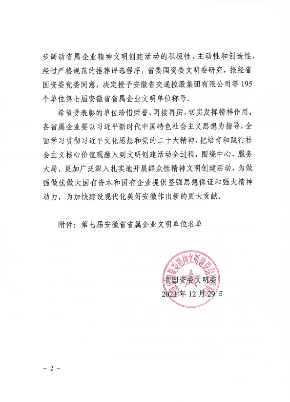 2024年,集團公司將按照省國資委文明委工作部署,堅定不移用習近平新時代中國特色社會主義思想凝心鑄魂,圍繞中心、服務大局,豐富精神文明活動形式,做好精神文明創建工作,凝聚干群思想、匯聚行動力量,奮力推動集團高質量發展。