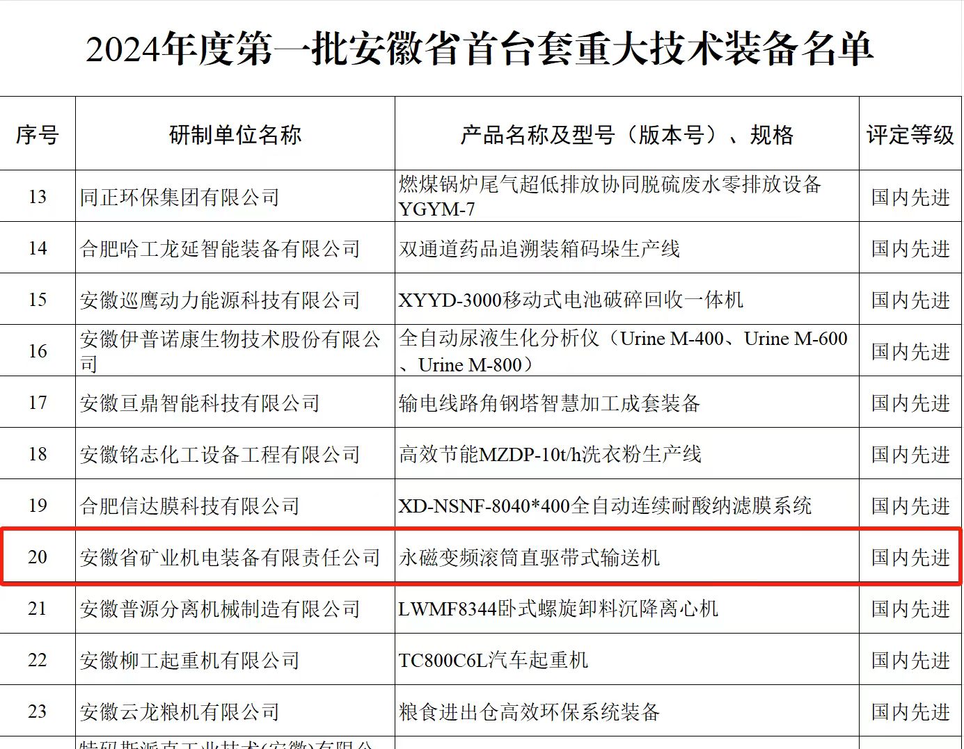 4月10日,筆者了解到,淮海實業集團研制的“永磁變頻滾筒直驅帶式輸送機”成功入選安徽省經濟和信息化廳公布的2024年度第一批省首臺套重大技術裝備名單。